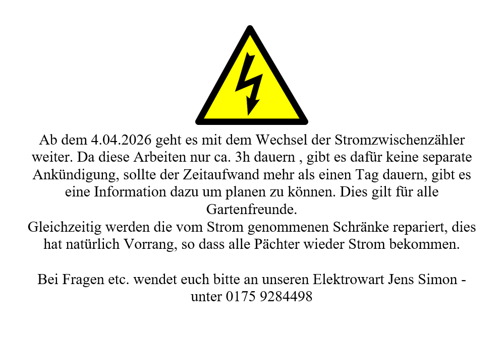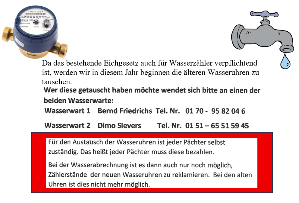 Das Wasser wird voraussichtlich am 21.03.2026 wieder angestellt. Bitte schließt vorher alle Wasserhähne und den Sperrhahn bei der Wasseruhr. Wasser bitte erst ab 15 Uhr entnehmen. Bitte überprüft dann eure Anschlüsse und Leitungen auf Wasserverluste. Bei Rückfragen wendet euch an Bernd Friedrich 0170 9582046 oder Detlef Borchert 0171 6365089 !